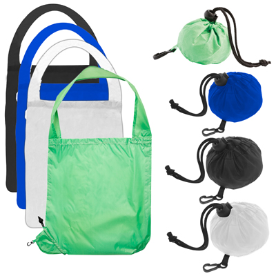 Quickly folds into a 63mm pouch with clip . Water resistant 170 denier polyester with no gusset . One large 50mm strap . Reusable and recyclable . 380mm w x 405mm h
