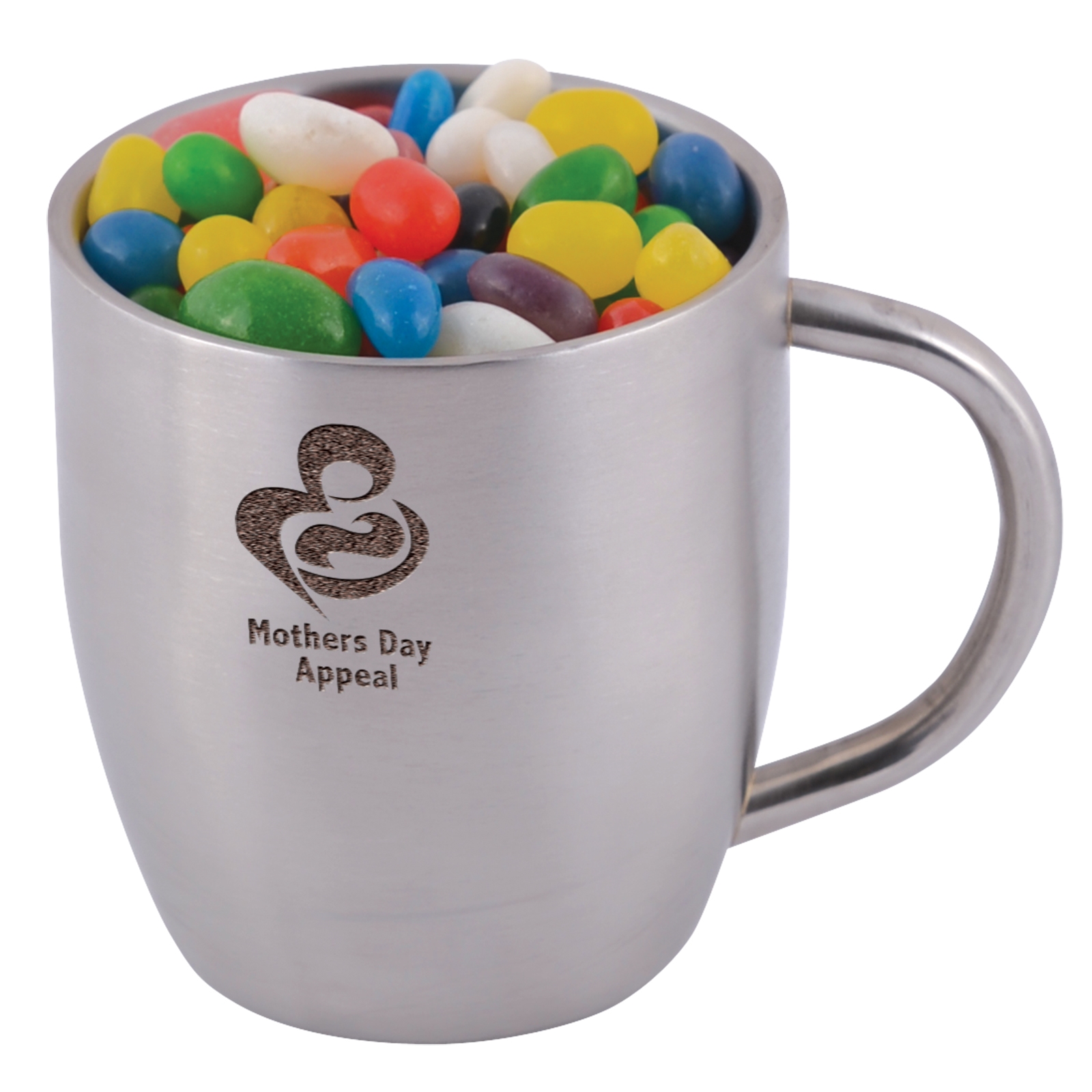 Assorted Colour Mini Jelly Beans in Double Wall Stainless Steel Barrel Mug