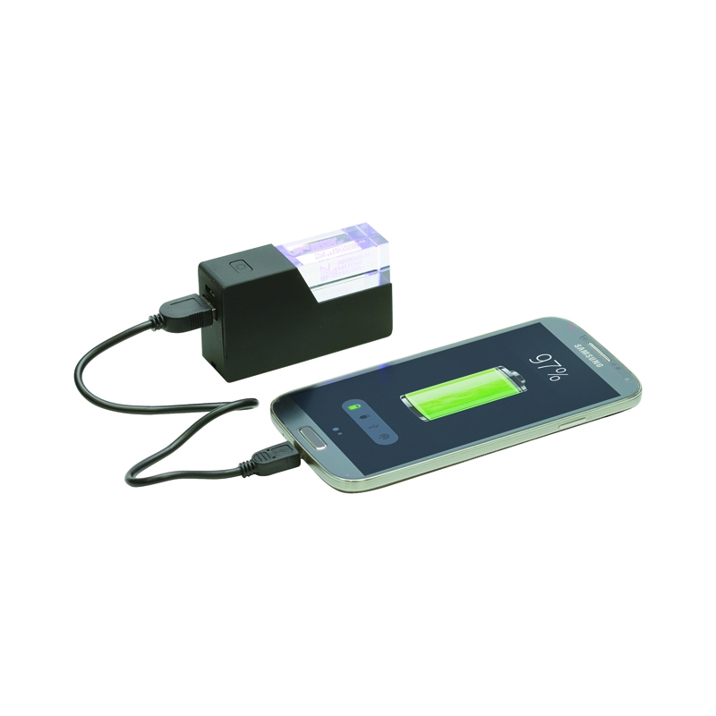 A single USB output, high powered light-up logo crystal and protection circuitry to stabilise the output voltage, prevent over charging and short circuit. Suitable for charging smartphones and most 5 volt USB powered devices. USB to Micro USB charge cable, lanyard and user manual included.